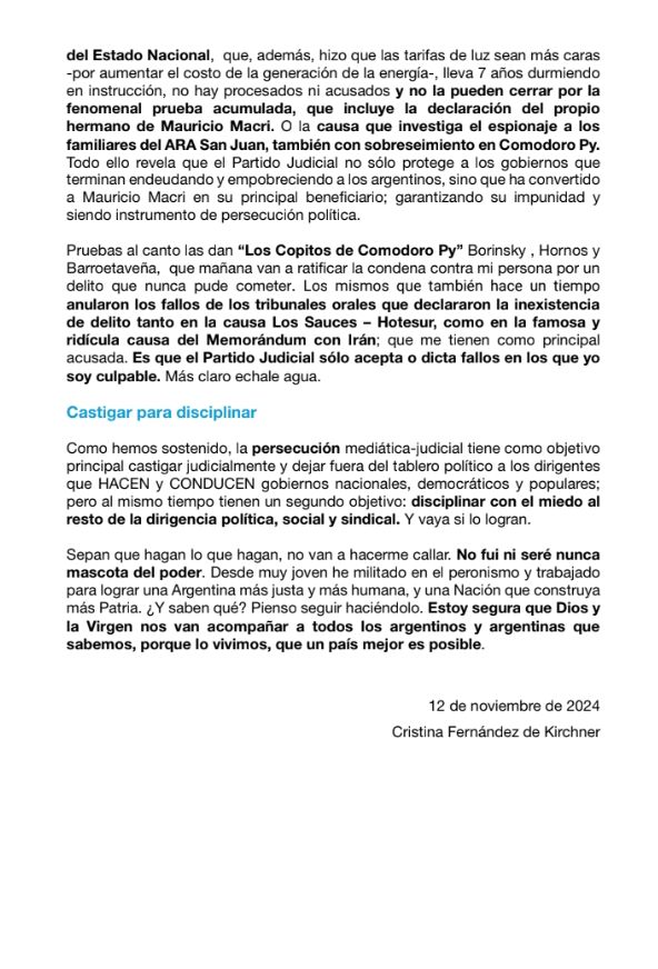 El comunicado también subrayó la determinación de Kirchner de no dejarse silenciar por las acciones judiciales en su contra. “Sepan que hagan lo que hagan, no van a hacerme callar. No fui ni seré nunca mascota del poder”, declaró, reafirmando su compromiso con el peronismo y su deseo de trabajar por una Argentina más justa.La ex presidenta concluyó su mensaje con un llamado a la esperanza, afirmando que “un país mejor es posible”, y confiando en que la fe y la lucha de los argentinos les permitirán superar las adversidades.Asimismo en diciembre de 2022, Cristina Kirchner recibió una condena de seis años de prisión en el marco de la Causa Vialidad, junto a otros ex funcionarios, pero también fue absuelta en ciertos aspectos.