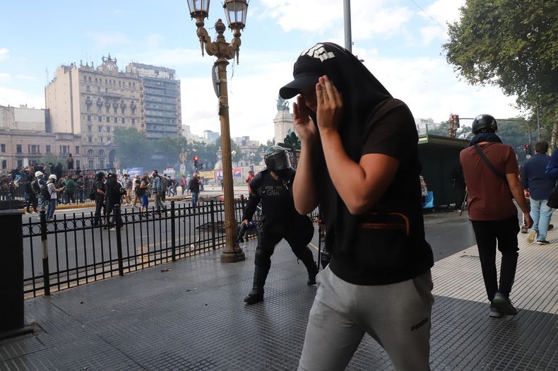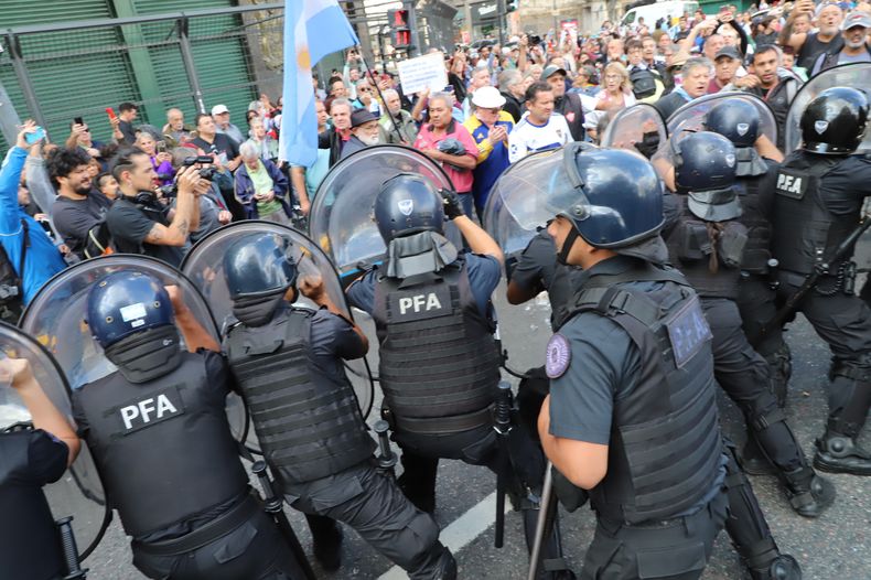En ese sentido la esquina de Callao y Rivadavia, efectivos de la PSA rodearon a un grupo de jubilados para evitar que bajen de la vereda para hacer un semaforazo, como estaba planificado.También se desplegó un cordón de fuerzas de seguridad para obligar a que una columna de sindicatos de la CGT no puedan salir de la Plaza Congreso.Asimismo, hubo gritos, corridas y empujones cuando los manifestantes quisieron marchar por la avenida Entre Ríos y fueron reprimidos por las fuerzas de seguridad, que, una vez más, volvieron a utilizar gas pimienta para dispersar a la multitud. Los comandados por Bullrich obligaron a los presentes a subir a la vereda, alegando cumplir con el protocolo antipiquetes.
