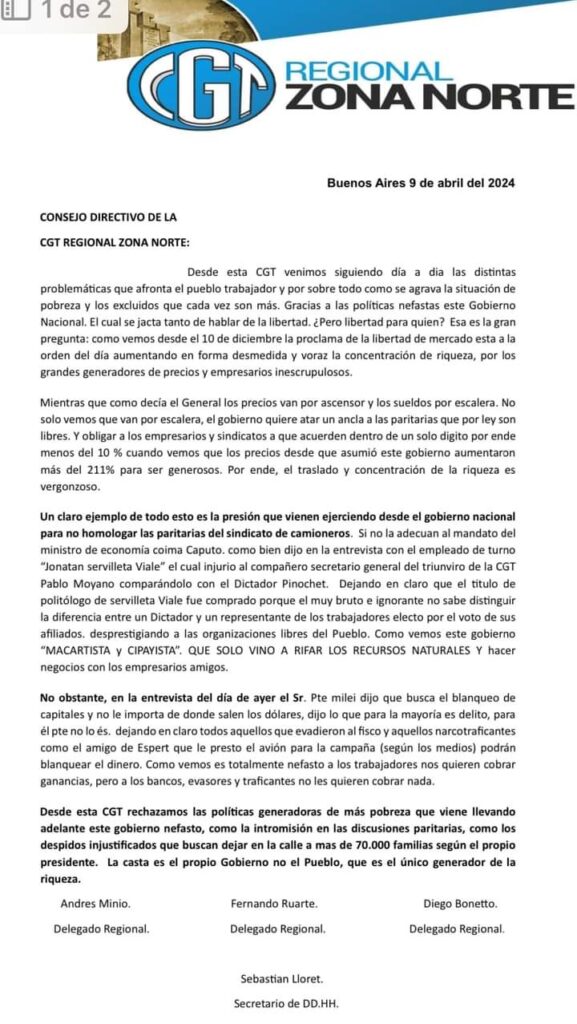 Desde el Consejo Directivo de la CGT Regional Zona Norte, rechazamos enérgicamente las políticas que generan más pobreza y que este gobierno nefasto está llevando adelante. No podemos permitir la intromisión en las discusiones paritarias ni los despidos injustificados que amenazan con dejar en la calle a más de 70,000 familias, según las propias declaraciones del presidente. La verdadera casta está representada por este gobierno, no por el pueblo, que es el verdadero generador de la riqueza.