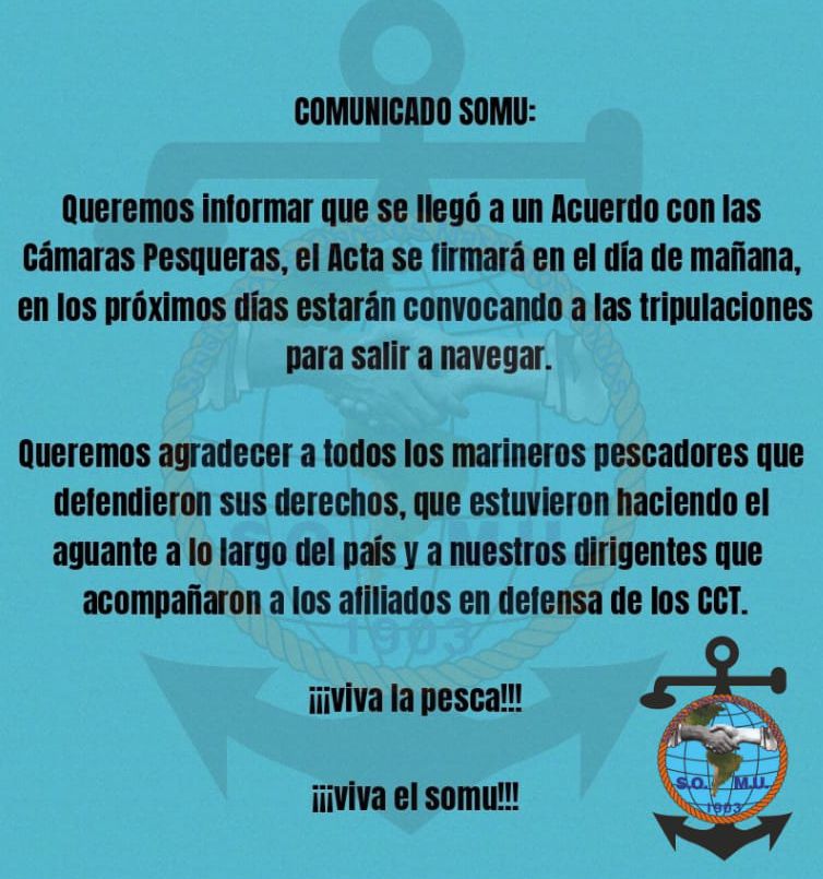 El Sindicato de Obreros Marítimos Unidos (SOMU), bajo la conducción de Raúl Durdos, emitió un comunicado revelando que se ha llegado a un acuerdo con las Cámaras Pesqueras.