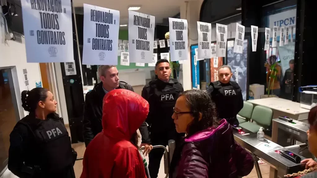 En ese sentido Rodolfo Aguiar titular de ATE Nacional, denunció públicamente que “están llenando de policías las dependencias públicas”. “No hay plata para comprar comida, no hay plata para comprar remedios, pero si hay plata para reprimir», En esa linea agrego“ Logramos ingresar a la mayoría de los ministerios y organismos. Pero tiene que quedar claro que hoy no termina nada, hoy empieza todo porque el Gobierno definitivamente va por la cabeza de los 70 mil contratados e intenta hacer desaparecer el Estado”, remarcó Aguiar en la puerta de ese lugar ubicado en Alem 650. Desde allí, convocó a un plenario de delegados de todo el país a fin de “definir una nueva medida de fuerza general antes de que termine esta semana”.