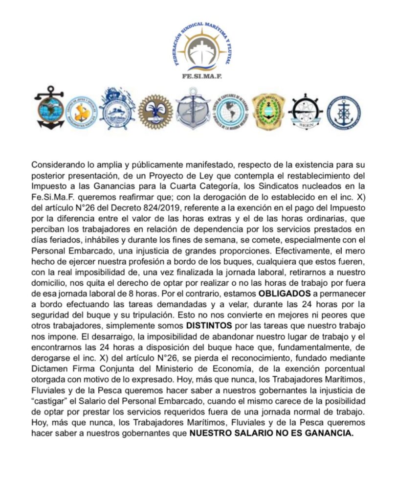 Los Gremios que forman parte de la Federación Sindical Marítima y Fluvial Fe.Si.Ma.F emititieron un comunicado de gran importancia Donde ha manifestado públicamente la existencia de un Proyecto de Ley que contempla el restablecimiento del Impuesto a las Ganancias para la Cuarta Categoría